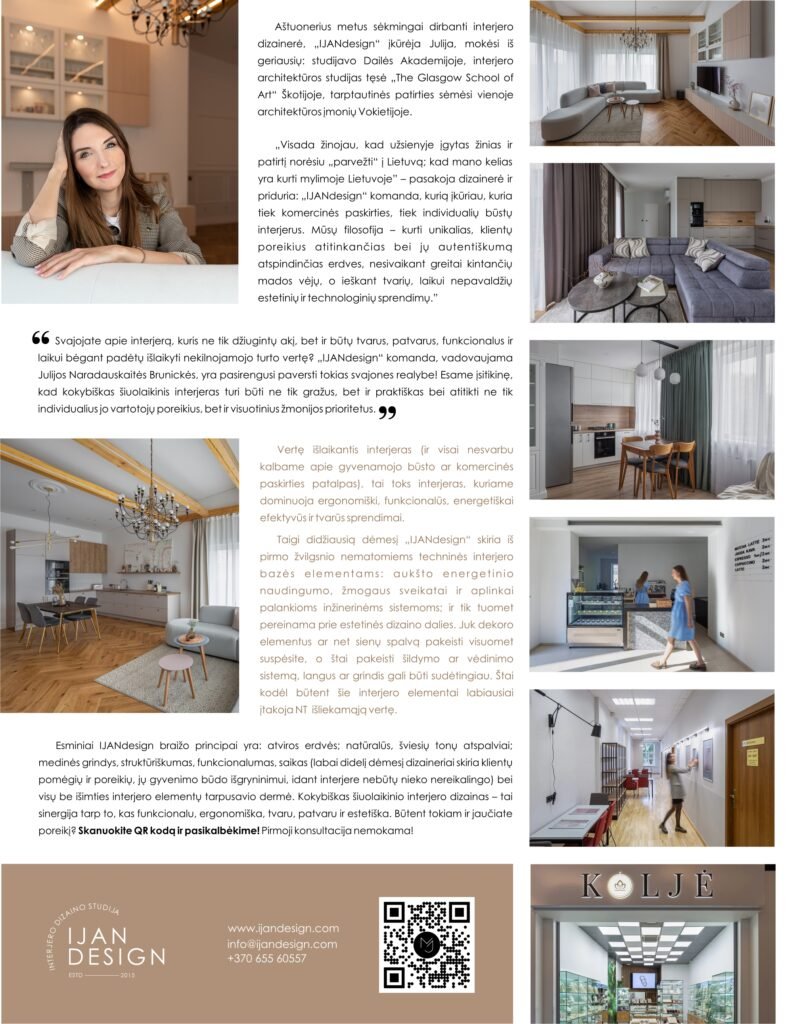 „Visada žinojau, kad užsienyje įgytas žinias ir patirtį norėsiu „parvežti“ į Lietuvą; kad mano kelias yra kurti mylimoje Lietuvoje” – pasakoja dizainerė ir priduria: „IJANdesign“ komanda, kurią įkūriau, kuria tiek komercinės paskirties, tiek individualių būstų interjerus. Mūsų filosofija – kurti unikalias, klientų poreikius atitinkančias bei jų autentiškumą atspindinčias erdves, nesivaikant greitai kintančių mados vėjų, o ieškant tvarių, laikui nepavaldžių estetinių ir technologinių sprendimų”.